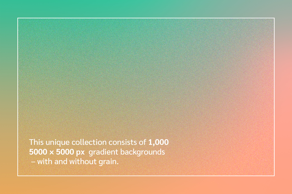 This huge collection consists of 1,000 gradient backgrounds (5000 × 5000 px · 300 DPI · Grain versions included). The bundle is perfect if you'd like to create social media posts, stories, posters, banners, or other web- and print designs in a consistent style.